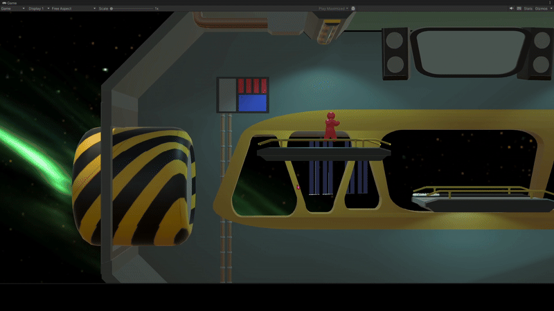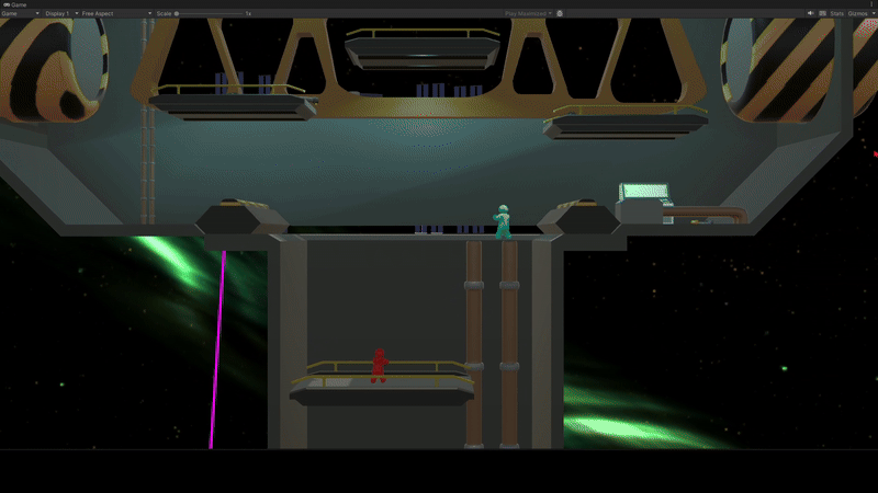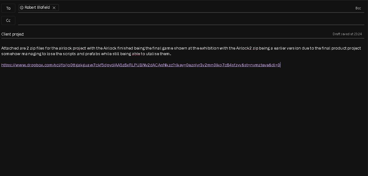 The project Airlock is an arena fighting game with the goal of your player knocking every other player in the match off the map and being the last standing in a free-for-all-like game mode. Use your fists and the items scattered around the arena to attack other players to systematically knock them back, aiming for the main doors of the airlocks with enough impacts, causing the doors to break away, triggering an Airlock breach, sucking the players across the areans towards the outside space requiring the players skill and luck to prevent being sucked out which would end up eliminating them. After a certain amount of time, if there is still more than one player standing, the winner can then be decided by a race which opens up below the arena, taking skilful movement to manoeuvre the shortest route down, with whoever first presses the button at the end winning the match.