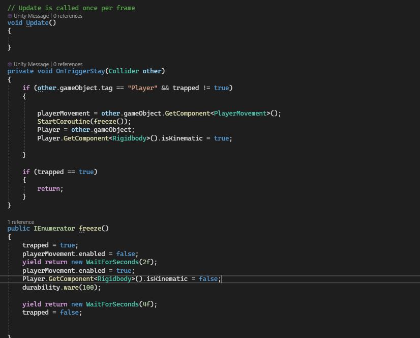 This is achieved through the use of a taller capsule trigger located in the centre of the asset, which, on trigger, figures out what player stepped into it and gets their movement script to trigger a “Freeze” event that sets the player speed to zero and stops the use of movement abilities. After a certain amount of time, the bear trap resets the player movement script and destroys itself from the game scene.