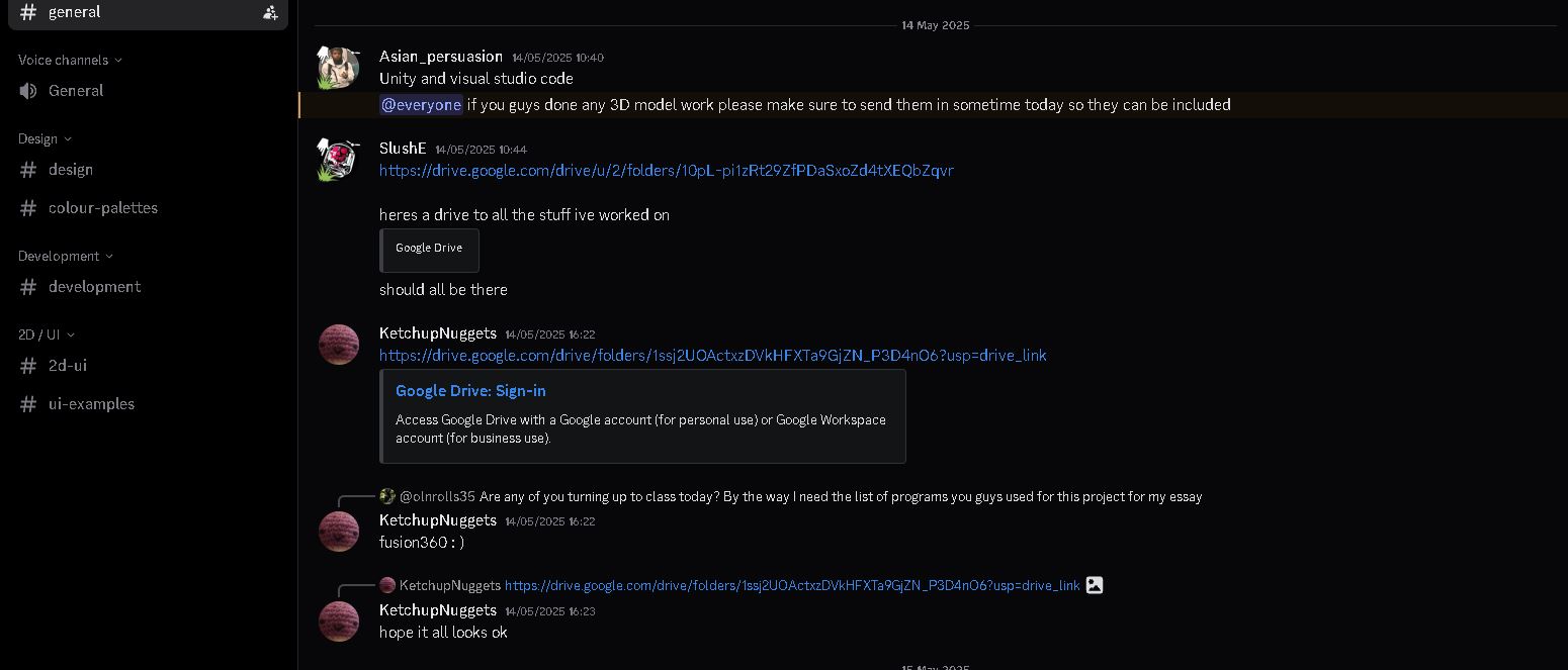The group mainly used Discord to communicate and share work, with some utilisation of Google Drive to collect the work together before sending it, making it more manageable and easier to locate.