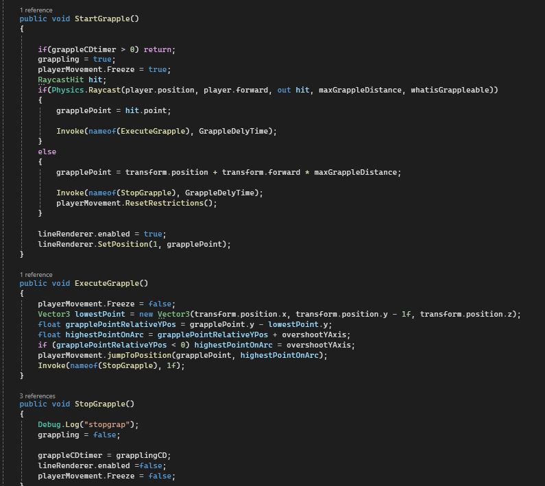 When the grapple gun is picked up, the script identifies it using tags and accesses its unique functionality. While held, it waits for input; once triggered, the gun fires a linecast from its front (an empty game object) forward. If it hits an object with the "grappable" layer, it calculates the force and path needed to reach the target. After reaching the endpoint or timing out, it resets and deactivates the linecast.