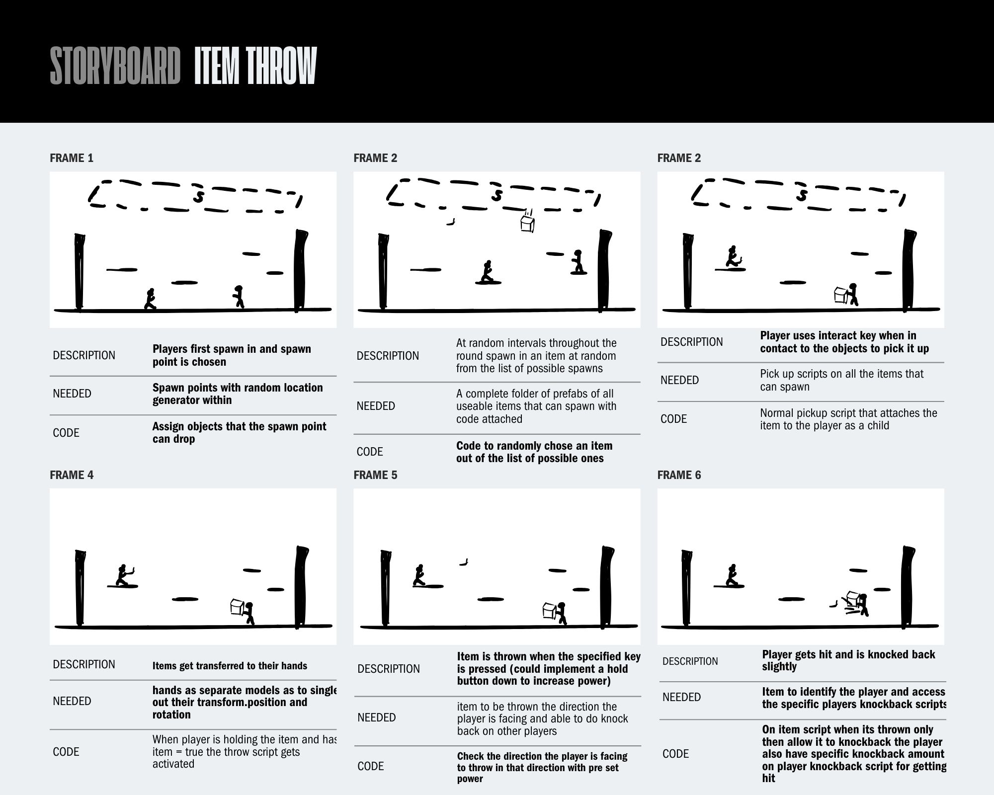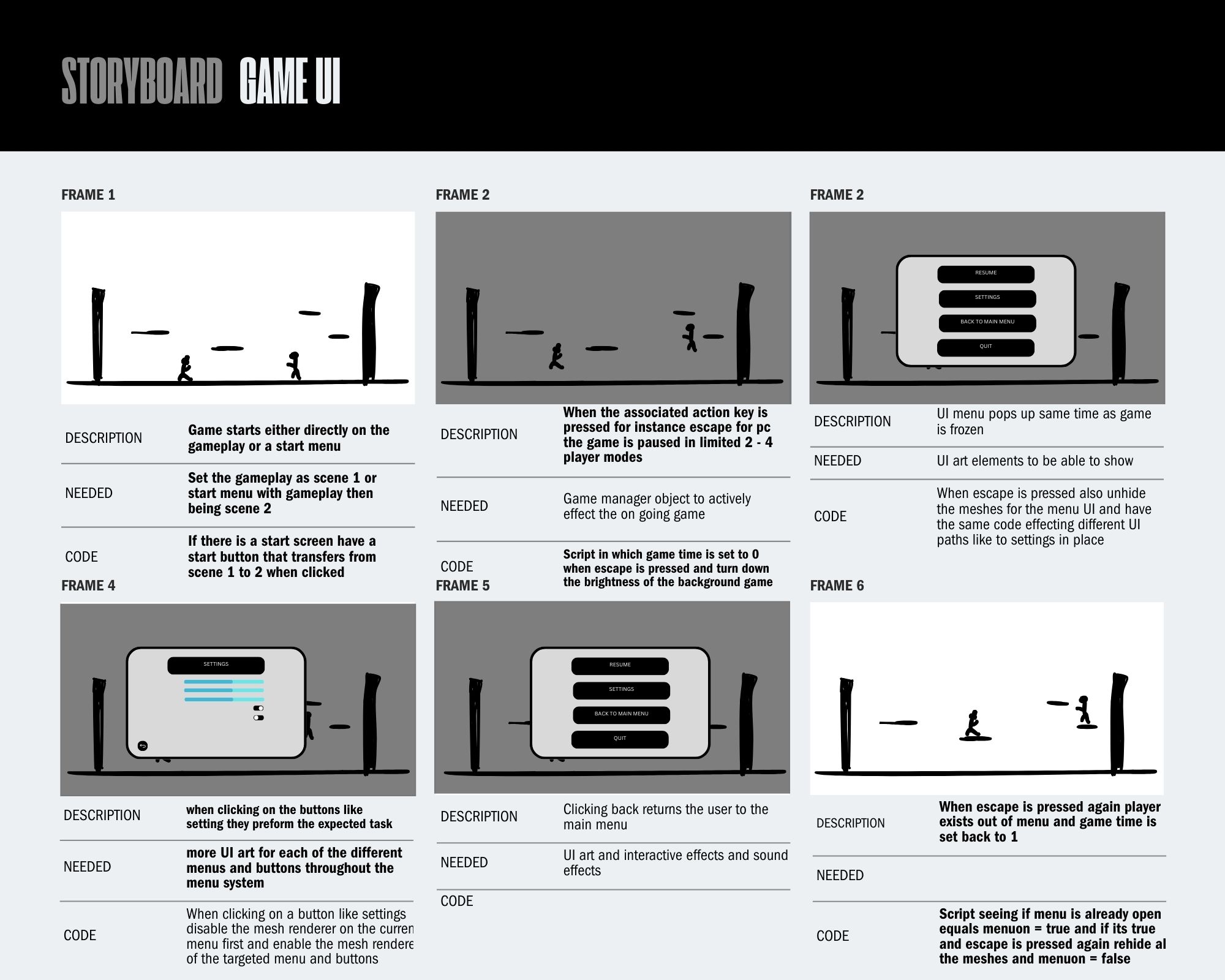 The third stage was further developing and visualising my ideas for the mechanics and code of the game, utilising storyboards to convey the actions that happen in-game while describing in text what is needed for that to happen and work properly.