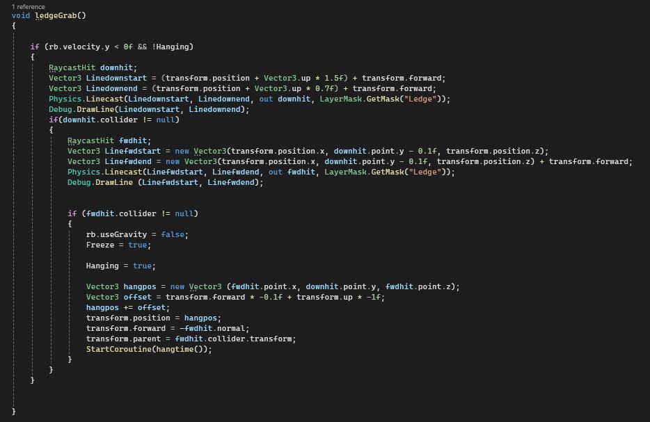 When pressing E, the player shoots out two raycasts forming an L facing towards the player mode, with the corner being the point of detection, checking to see if it hits anything tagged with “Ledge”. If so, transforming the player's positions and rotation to match the platforms, as well as setting the player's parent to the platform to move with it.