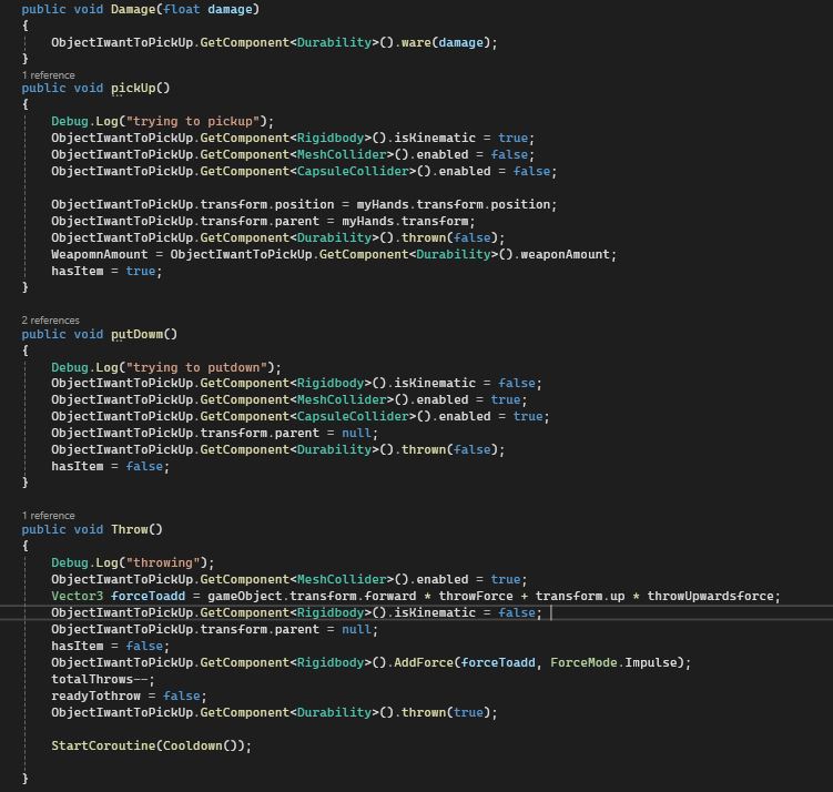 Enables the player to pick up a singular object at a time when in collision with an item when pressing the input action of F, which you could press again to drop the item you are holding. While an item is held, it allows the player to press X to throw the object out of their hand in a straight path in the direction they are facing, and if the object collides with another player, it deals some knockback to them.