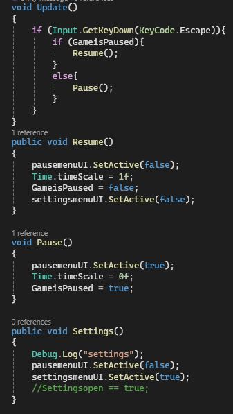 A system to be able to toggle and untoggle the pause menu by pressing escape on the keyboard, with the game pausing in the background when it appears. Through the use of the pause menu, the player can select different actions, mainly returning to the game, quitting the game and the settings menu, where, in the fully developed version of the game, you would be able to adjust settings such as the volume to adjust the gaming experience to your preference.