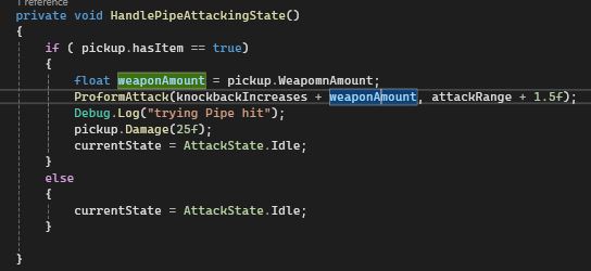 When picking up a weapon, its durability script has a float specifying the weapon's damage and attack range that can be changed in the inspector. When picking up the item, the attacking script links to the durability script and uses that float as the damage/knockback to be applied to the enemy in the attack while it is held and takes the attack range when figuring out the hitbox size for the item.