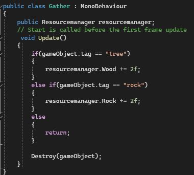 The gather script grabs a referance to the resource manager and uses if statements for each resource type so when the unit runs into the gameobject it checks what tag the resource has and depending the certain resource gets added to the count on the resource manager and destroys the gameobject. this can be improved in the future by instead of simply running into the object you can proform an action to destroy and gather the resources.