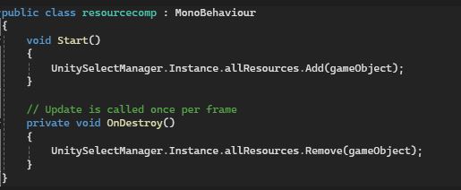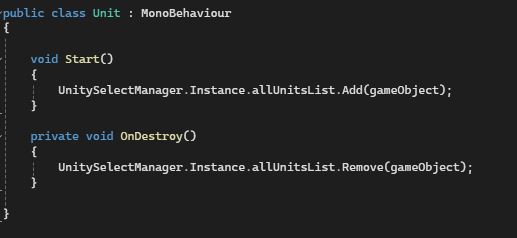 This code is implemented onto the prefab of anything selectable so when they load in they automatically get added into the allUnitsList so the game can always keep track of how many units are active at one time. could maybe combine the similar scripts for this into one and check tags for where they belong and sort them that way instead of having a different script for every list.