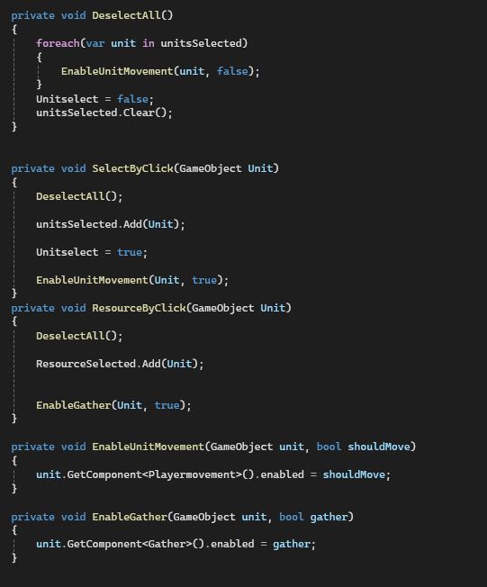 The code for the Unity selection manager works by first checking that it is the only instance of it running by when the code loads it checks if there's another instance and if there is and it isn't called "this" it gets destroyed If there isn't another instance the current one gets called "this". the selection manager works by creating lists for in this case all the units in the game where it finds all instances of the gameobject that's declared in the inspector then the other lists remains empty where when you click on a unit they get put into the other list which runs a routine that enables the movement code on the unit prefab. the actual selecting is done at the start of the code it gets a reference to the main camera and for every frame it checks if the player clicked on the screen and it uses a raycast from the position of the click on the main camera and fires the ray in a straight line directly ahead and if it hits something that is on a laymask declared clickable it selects the gameobject it hit. if the ray doesn't hit anything that's declared hittable it deselects whatever is in the selected list and disables that gameobjects movement script. this script was also used for other mechanics like gathering resources. I might have been able to improve the script by having to use fewer individual lists and instead one big list with everything in it and figure out what happens to the object through tags but this may also be a worse way as I haven't used lists often.