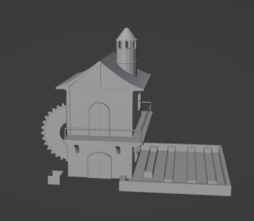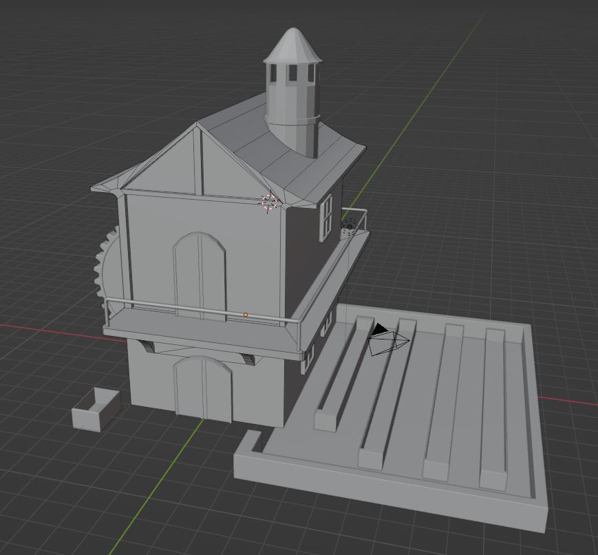 The windows were done similarly to the door but the inner struts are crossed the railing for the balcony was made with cylinders and the corners are where 2 cylinders faces are selected and you bridge the gap and bevel it.