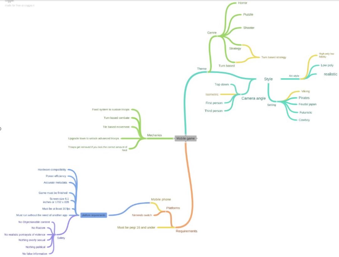 I created the mind map to help with the idea generation process in the beginning stages and set the outlines of our options what we needed the software we were going to use and the specific requirements that we needed to uphold while making the game.