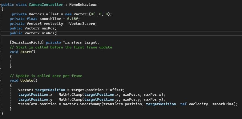 The camera controller works by declaring what we want the camera to follow by grabbing their position and adding an offset that is declared in the start to add padding then setting the allowed camera boundary by mathf.Clamping the position of the X and Y axis the actual movement comes from the transform position to equal the target position with a smoothdamp added. could have added features to allow for customisable stagger of camera and the smooth time so the player can choose.