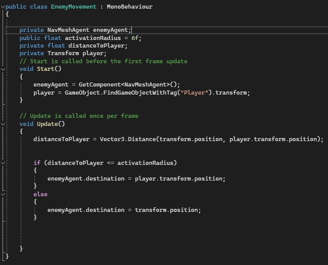 This script allows the enemy to track and chase you when you enter the declared activation range. It traversed the environment using a NavMeshAgent. At the start, it grabs the navmesh on the enemy and sets a variable player where it tracks the position of any game object with the tagged player on it, everyframe it checks the distance to the player by getting the player's position and its current position. if the distance to the player is within the activation radius it sets the destination to the transform position of the player else the destination is set to the enemy's current position so it doesn't move.