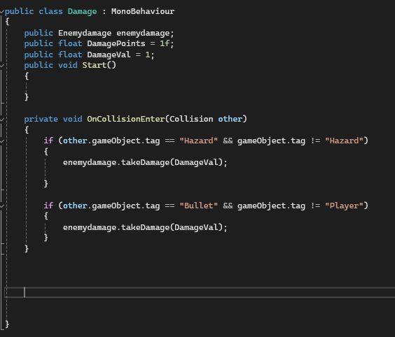 The damage script lets anything that is attached take damage as long as it completes the if statements. this script was also from the first project as it still worked well enough for this game that I only had to tweak it slightly