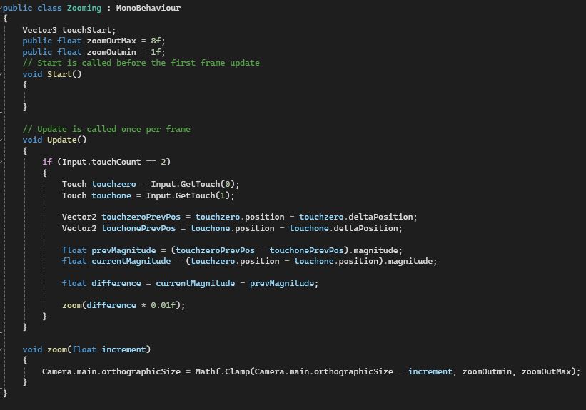 The zooming works first by setting the minimum and maximum distance that you can zoom in and out with then every frame the code checks to see if you actively have 2 fingers touching the screen if that is true it declares the input of both fingers individually so the code can use the positions to figure out what way the fingers are moving by comparing the position of the fingers when they first touched the screen and the current position and with that current value and previous position value from both fingers then they get minus from each other and to see if they were moving apart or together then zoom by the value of the difference of the current and previous magnitude. the zooming function just gets the main camera orthographic size clamps how far it can zoom in and out and then changes the size based on the value of difference.