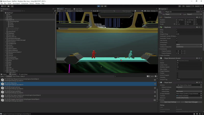 When the grapple gun is picked up, the script identifies it using tags and accesses its unique functionality. While held, it waits for input; once triggered, the gun fires a linecast from its front (an empty game object) forward. If it hits an object with the "grappable" layer, it calculates the force and path needed to reach the target. After reaching the endpoint or timing out, it resets and deactivates the linecast.