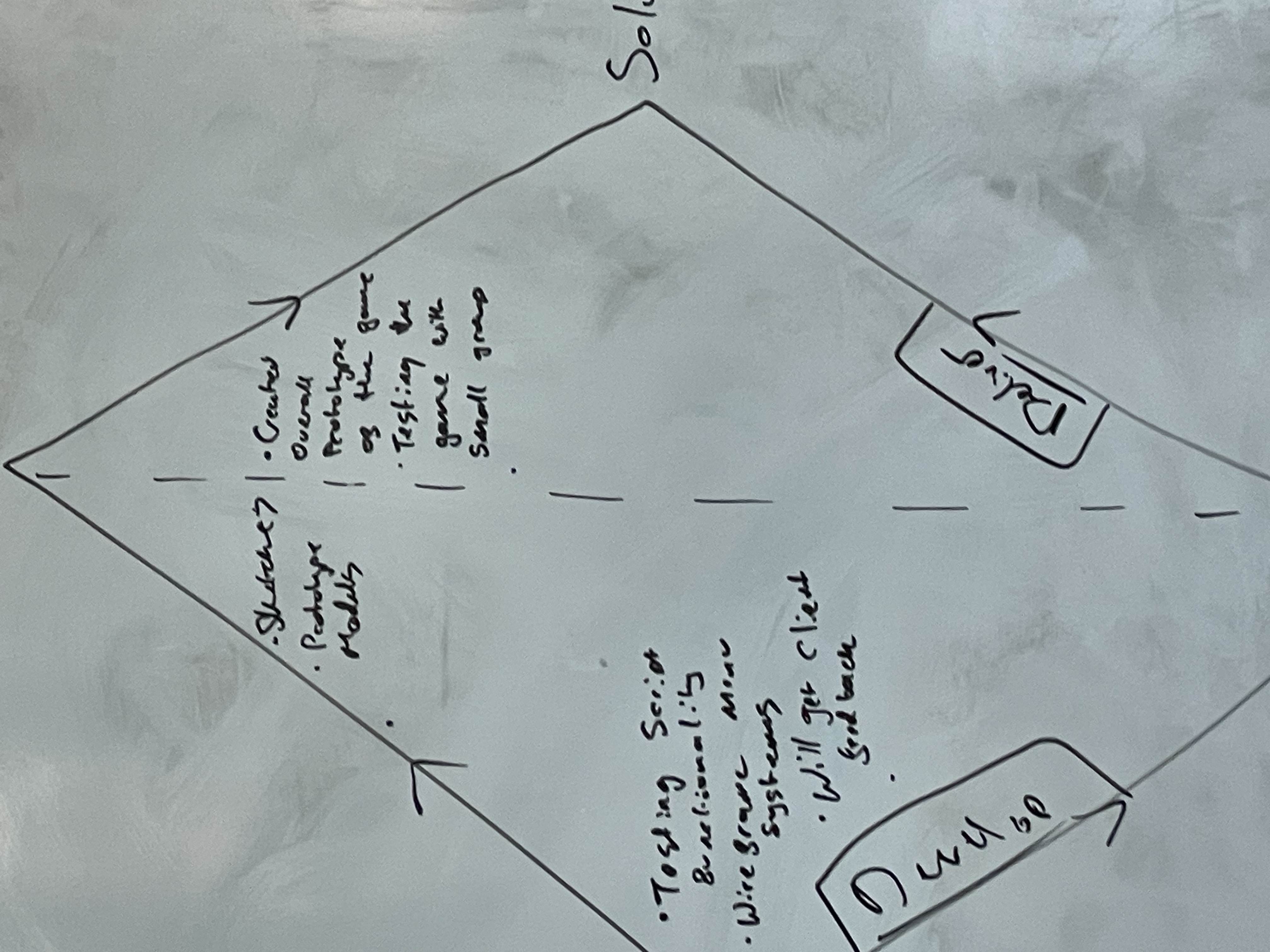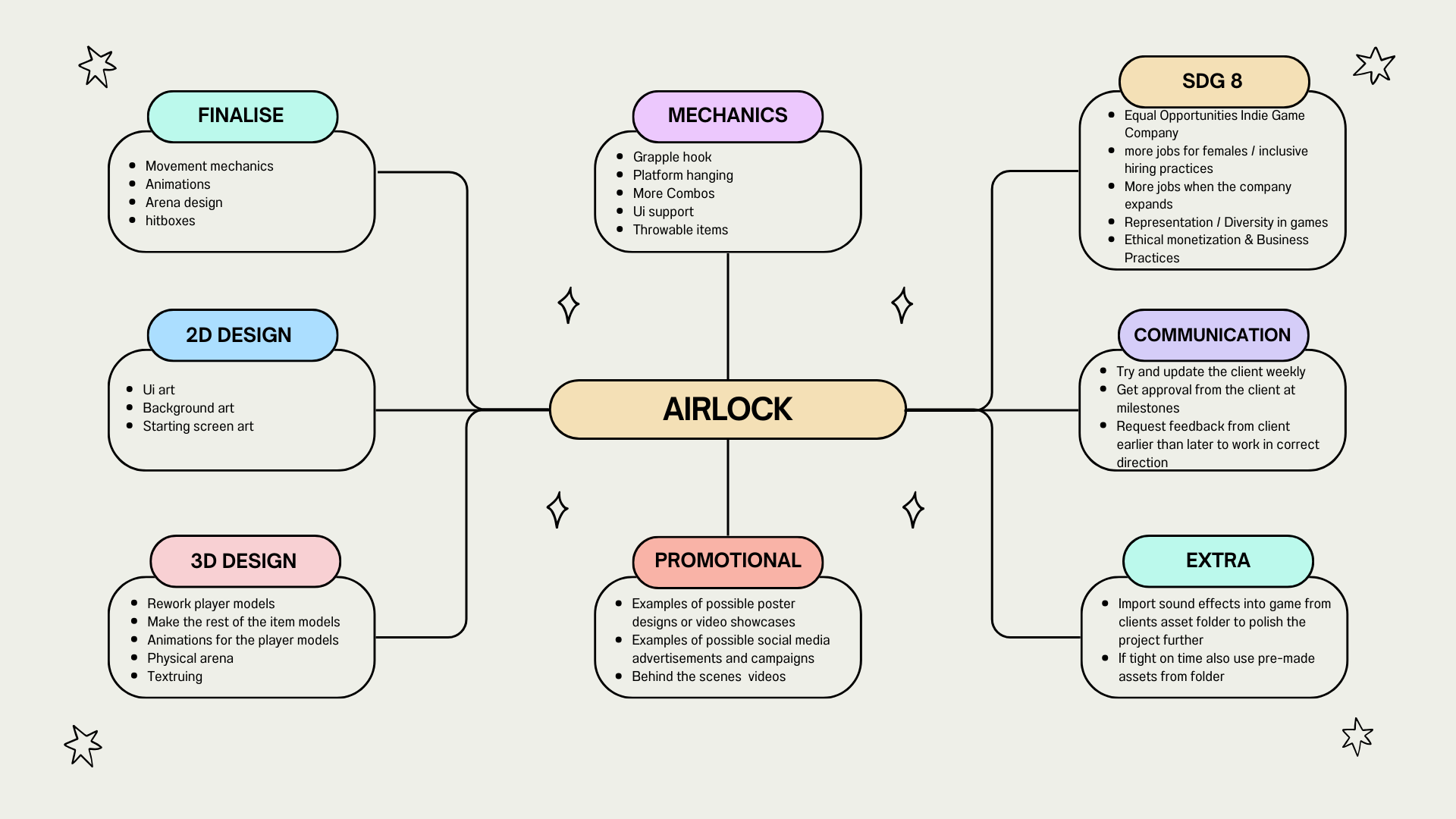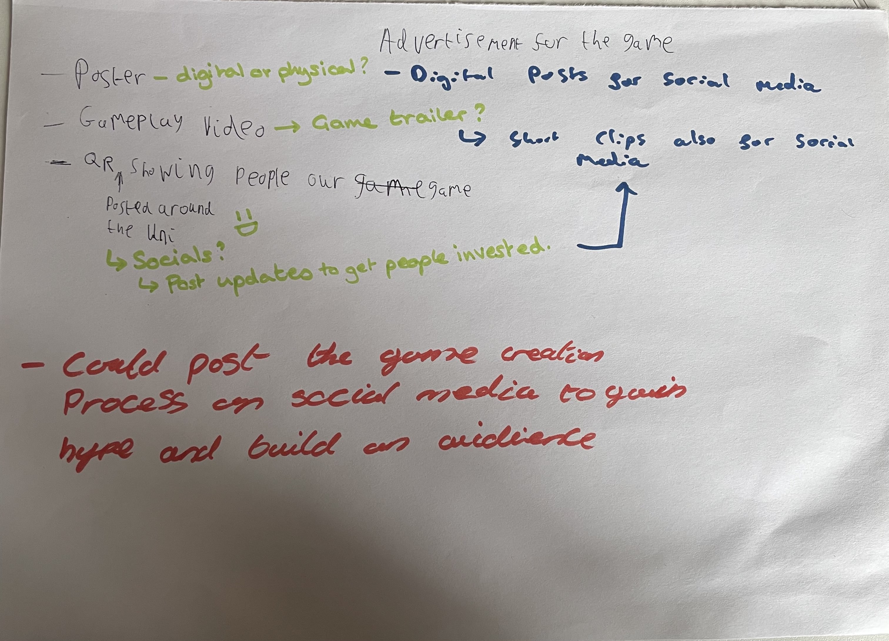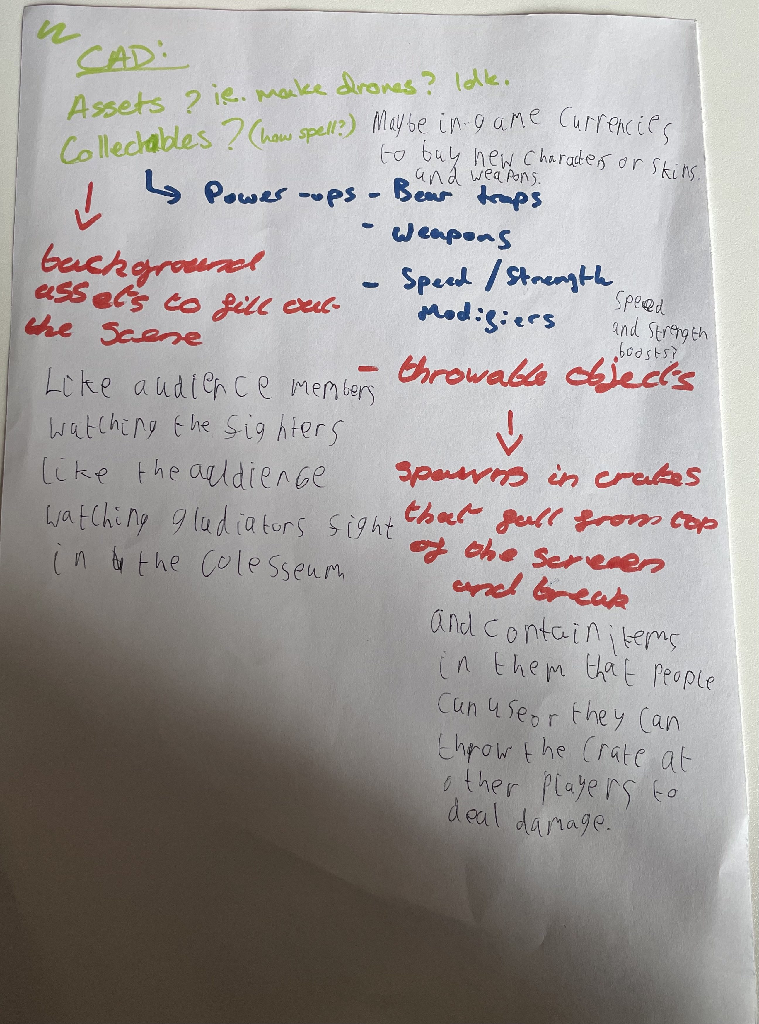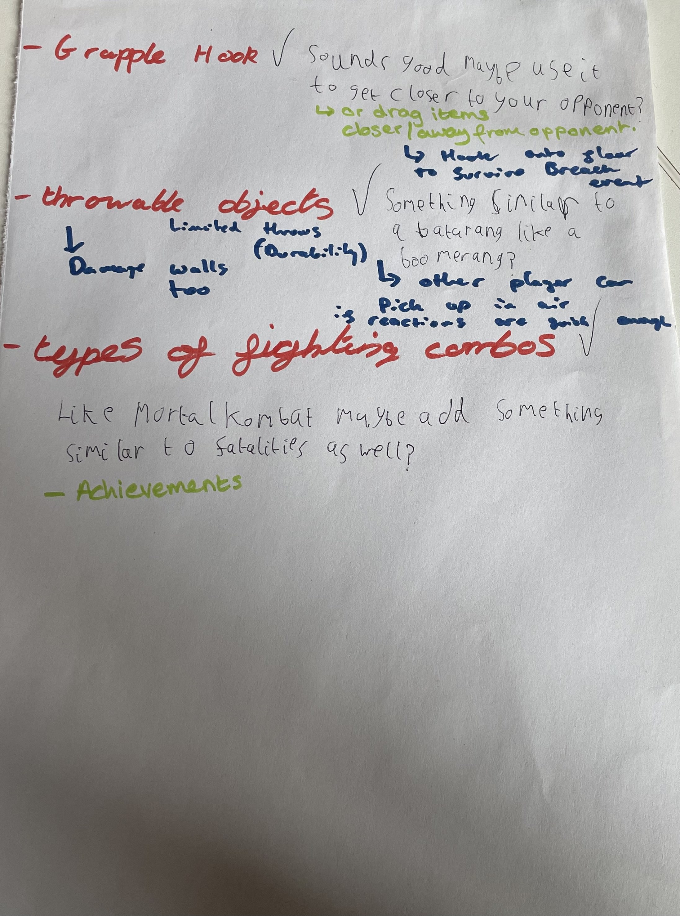 he second stage of pre-production is a brainstorming activity to further build upon individual ideas for the project as well as to improve group cohesion and better the later work as a group according to (Paulus, P. B. and Nijstad, B. A. 2003) , to polish them to be viable when attempting to implement them in the later stages of development with every group memeber at the start being given a blank piece of paper where they can write any ideas they have within their specialities onto it. Afterwards, passing the paper to the teammate on the left to let them further develop the idea or write down anything they want to include and so on, this happens until the paper reaches back to the person who wrote the initial ideas onto it. In the end, it helps the initial rough idea become developed enough to accurately be worked on during the development process. For example 1. Grapple hook 2. Use it to get closer to your opponent 3. Or drag items closer/away from the opponent 4. Hook onto floor to survive breach event. As well as a mind map to fully map out the work that needed to be done to successfully improve the project to our desired outcome, dividing and collecting them into their related specialities like code and 3D design.