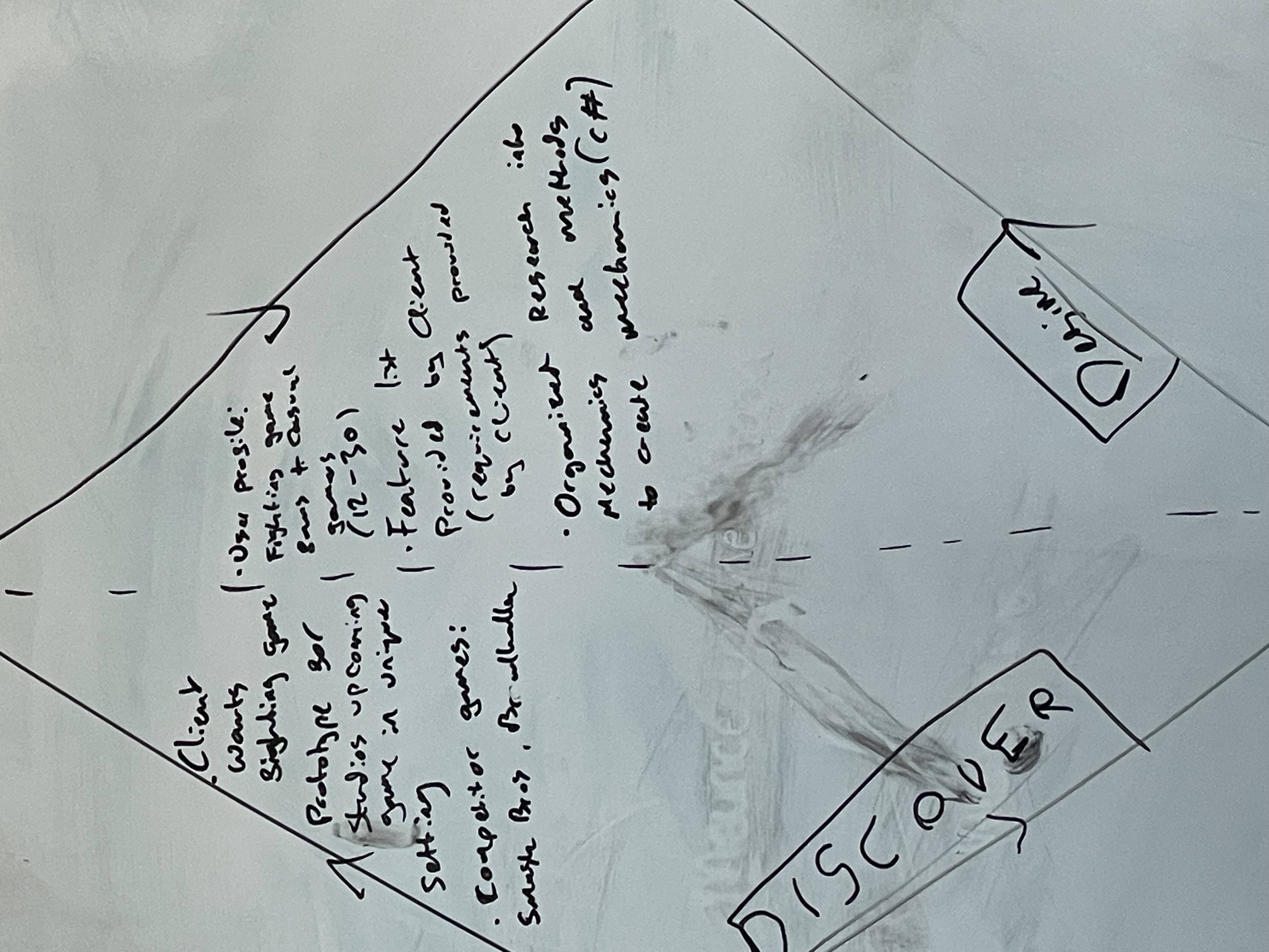 For the first stage of pre-production, we utilised the double diamond design process made popular by the British Design Council to be able to have a structured framework to identify and troubleshoot our production cycle, understanding the tasks as well as the target audience and their age range. Balancing it all with the client's needs. Utilising this activity, the group managed to narrow down the target audience to casual gamers between the age range of 12-30, with the client referencing games such as Smash Bros and Brawlhalla being a similar concept to what they envision, as well as competitors in the market.