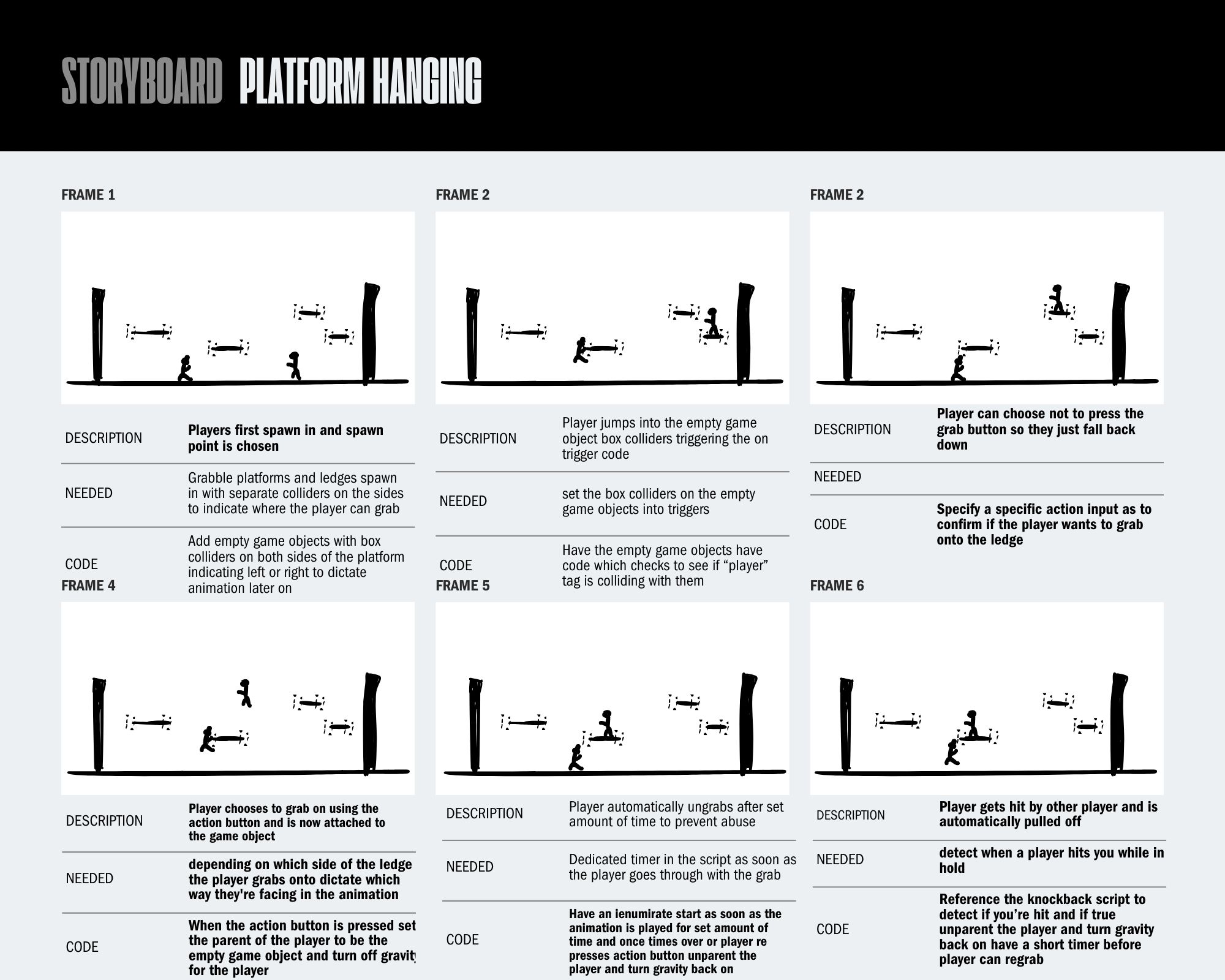The third stage was further developing and visualising my ideas for the mechanics and code of the game, utilising storyboards to convey the actions that happen in-game while describing in text what is needed for that to happen and work properly.
