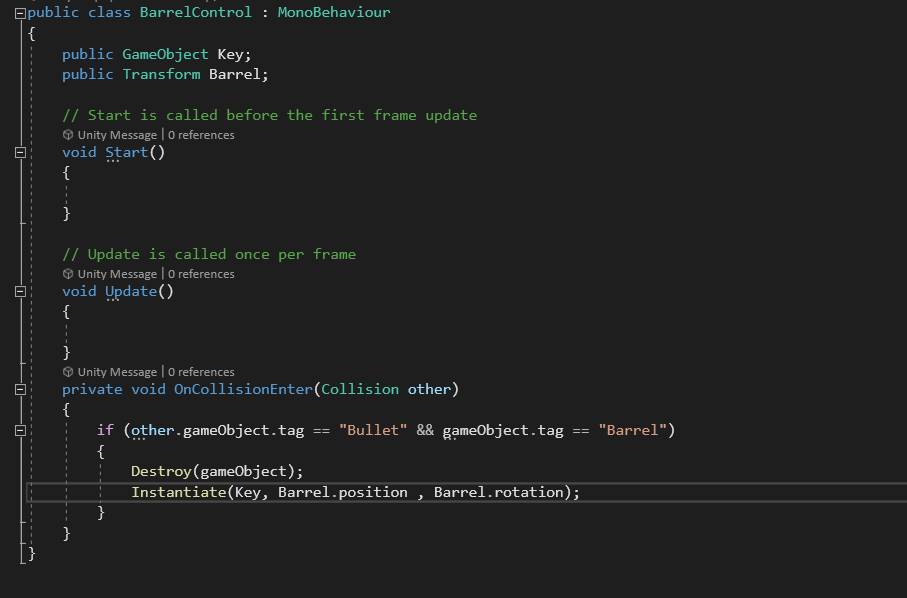 The barrel controls makes it so when it is applied to something with the tag "barrel" and gets hit by something with the tag "Bullet" it destroys the barrel and in its position it instantiates a key prefab with all the code it needs.