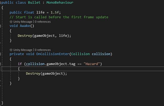 This script applies to the bullets itself and tells the bullet when it needs to be destroyed either when the life runs out which is 1.5f or when it hits something tagged "Hazard"