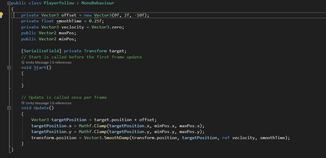 this code is for the camera to follow the player in a smooth way that doesnt hurt the eyes when there is sudden and fast movement the mathf.Clamp keeps the camera from going out of bounds and the targetPosition adds and offset as to trail the player slightly behind and then to actually follow the player it has a transfrom.position with vector3 smoothdamp so the camera is smooth and smoothtime so the camera doesnt snap to the player