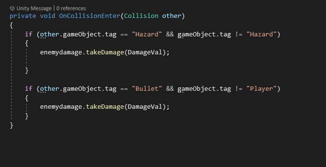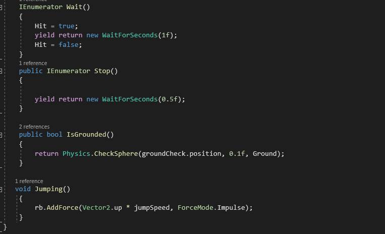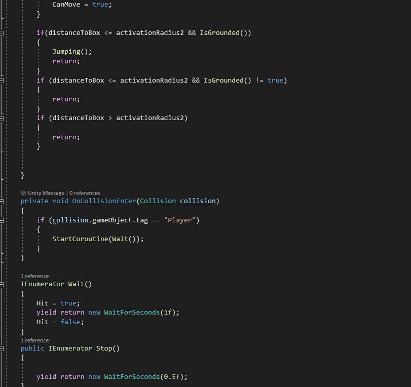 theres also similar code for the distance from the bos however in this case if the box is close enought to the enemy it can jump over it as before hand they were easy to deal with as they could get stuck behind the box the if statements require a ground check before it can execute the jump coroutine as otherwise the enemy would keep jumping constantly until the box was out of the activation radius. then theres another methode to stop the enemy from moving once the player is hit by detecting if iit has collided with something tagged with "Player" and when it does the coroutine (Wait) starts where it waits for 1 second using an ienumerator.