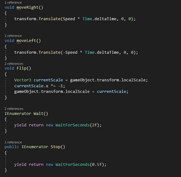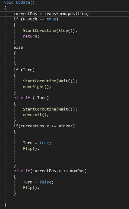 the first piece of code is if ouch from playermovement = true then the enemy this is attached to will also stop moving. when the enemy reaches the max position it switches the Turn bool to true and also flips the model with the same code as with the player. when turn is true it tells the code to run the coroutine moveRight and vice versa when turn is false.