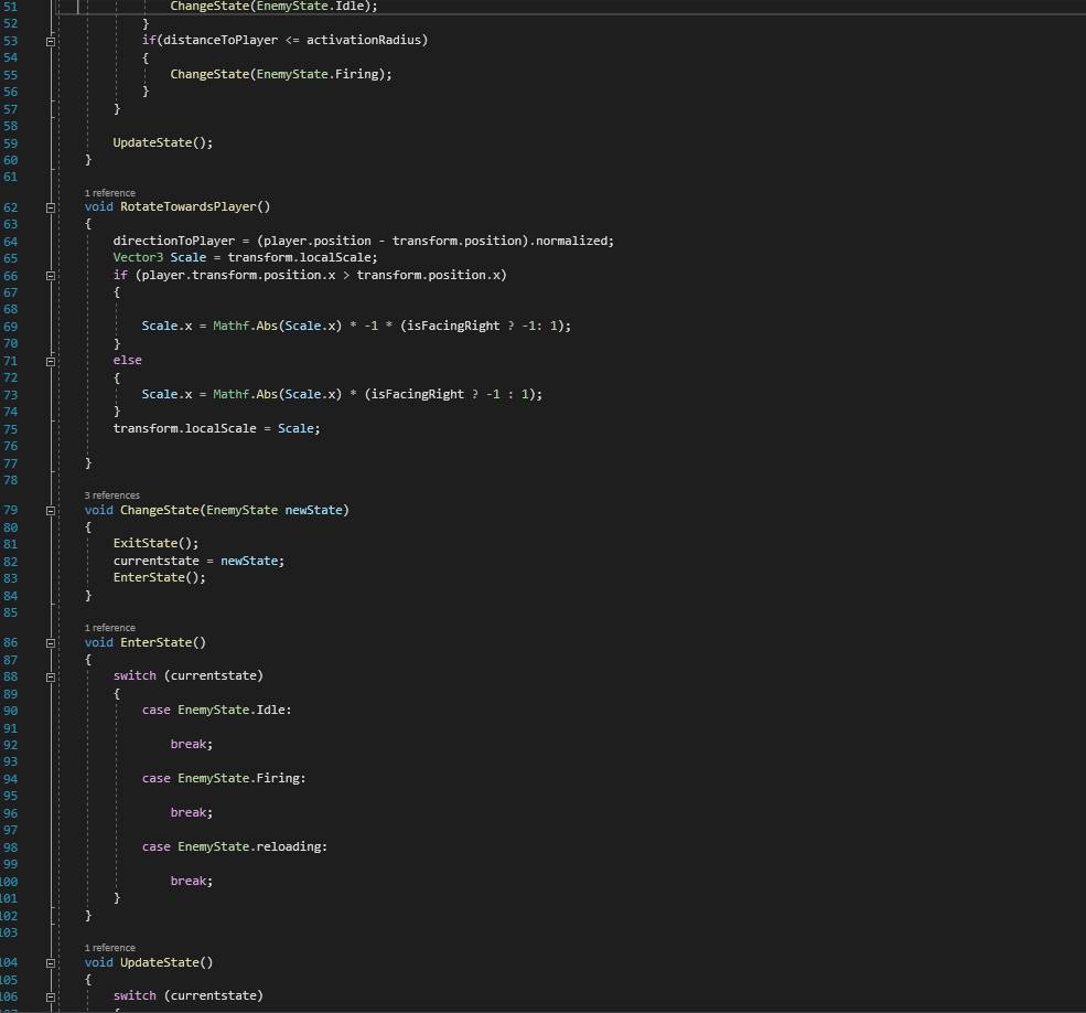 The code for the EnemyControl3 script was mostly all done by my lecturer Robert Blofield in his Computer Game Design Principles class during week 10 of semester 1 where we got taught state machines and step by step copied most of the code while fixing some intentional errors that were designed to challenge us stats work by setting what will happen when running the state like for example in the code for in enemystate.Firing when in the state it runs code to fire projectiles at the player where as in the void update you can set if statement for conditions when to switch states this is more advanced and efficiant than using multiple bools to do the same thing. the only code within the script that was not done by Rob would be the player flipping which was the same code as used in my other scripts to flip player models as the 3D rotation using quaternion slerp that was provided did not work with my game.