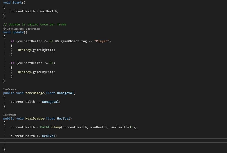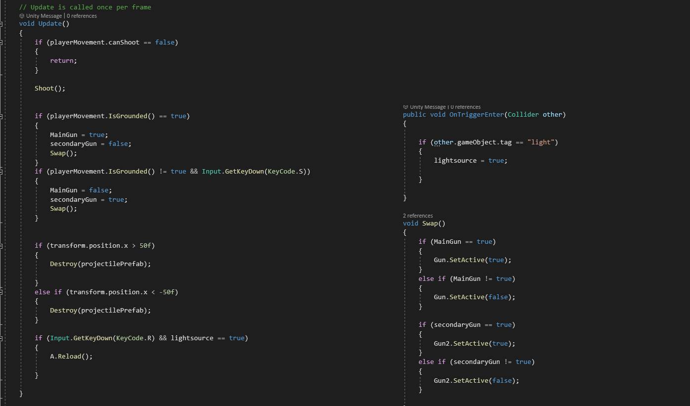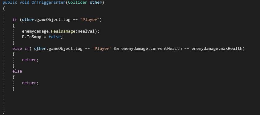 The lightControl script allows the player to heal themselves under it with the assigned healthvalue within the script once whenever the player is in the trigger "light" it also sets InSmog false as to restore the players movement speed. the else if is for if the player is already at max health it doesnt run the code.