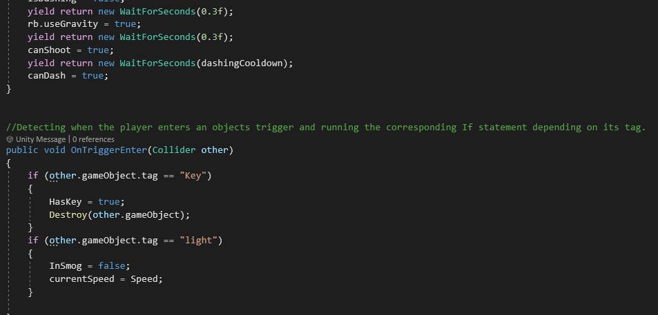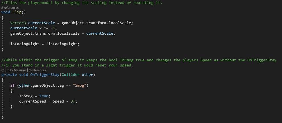 the (Flip) routine flips the player model around depending on which direction it is moving in by transforming the models scale by times -1 which either makes it negative making it face a certain way or a negative times a negative makes a posative making it face the opposite direction. with the ontriggerstay it is used to change the players speed as long as it is staying in smog and isnt under a light.