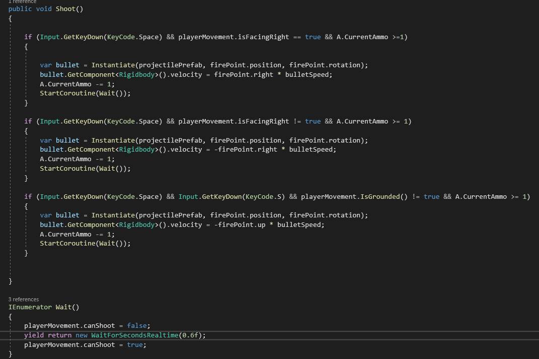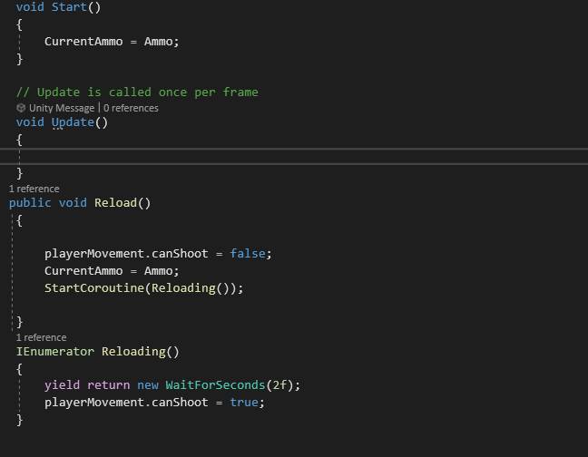 This script is to controll the ammo for the players gun as the player actually has 2 different gun for shooting straight ahead and also shooting down so to properly have a single ammo counter instead of one for each gun I needed a seperate script for them. this script just sets current ammo to the max ammo at the start and takes away 1 every time the gun is shot and for reloading the currentammo gets reset and it starts a coroutine where you cannot shoot again until it is over
