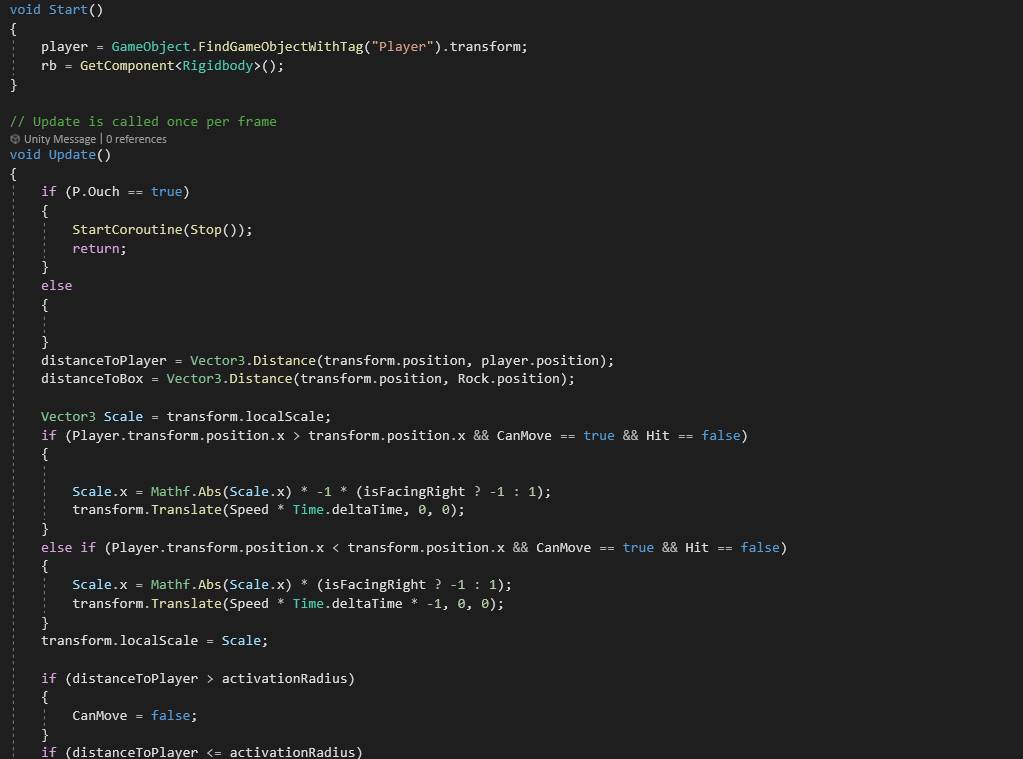 The script for the second enemyController starts with getting the players position through looking at the transform of what ever is tagged "player" and also getting its own rigidbody for later code enabling jumping then theres also the if ouch true code snippet to stop the enemy if the player has been hit as not to instantly kill the player in some scenarios. the code then contstantly gets the distance from the player and also from a box that the player can move around by comparing its position and the player / box's position. then the next if statement requires the player's x position to be more thank its own then it will execute the code which makes it first turn to face right by once again flipping the scalling of the model by negative 1 and makes the enemy move in that direction towards the player. same applys for the else if but for moving left. there is also an activation distance that is set at the start amd if the distance from the player is more than it the code stops the enemy from moving and only when the player walks into the activation radius the enemy can start to move to attack them.