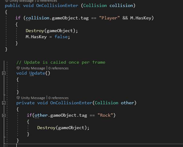 This image is the combanation of 2 scripts both the hatch control and glass break control. for the hatch control when it collides with something tagged "rock" it will be destroyed. and the hatch also gets destroyed by it has to meet the requirements of both it being the player and HasKey must equal true, when the code is run HasKey gets set false so another key can be picked up and also so the player can run through the levels without trying to find the key.