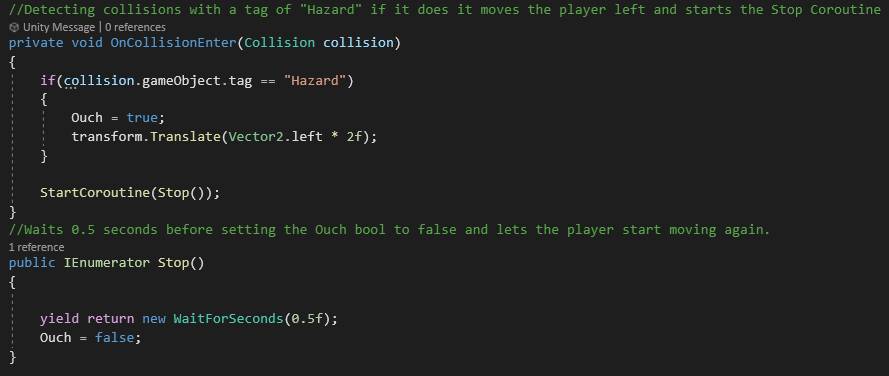Checking for a collision with the players capsule collider and if whatever the player collided withs tag is "Hazard" the if statement will run setting Ouch to =true which will stop the player and enemy movement temporarily accourding to the coroutine(stop) which will run for 0.5 seconds then set ouch to false allowing everything to move again. also the if statement moves the player left by a certain amount to stop staying in the collider.