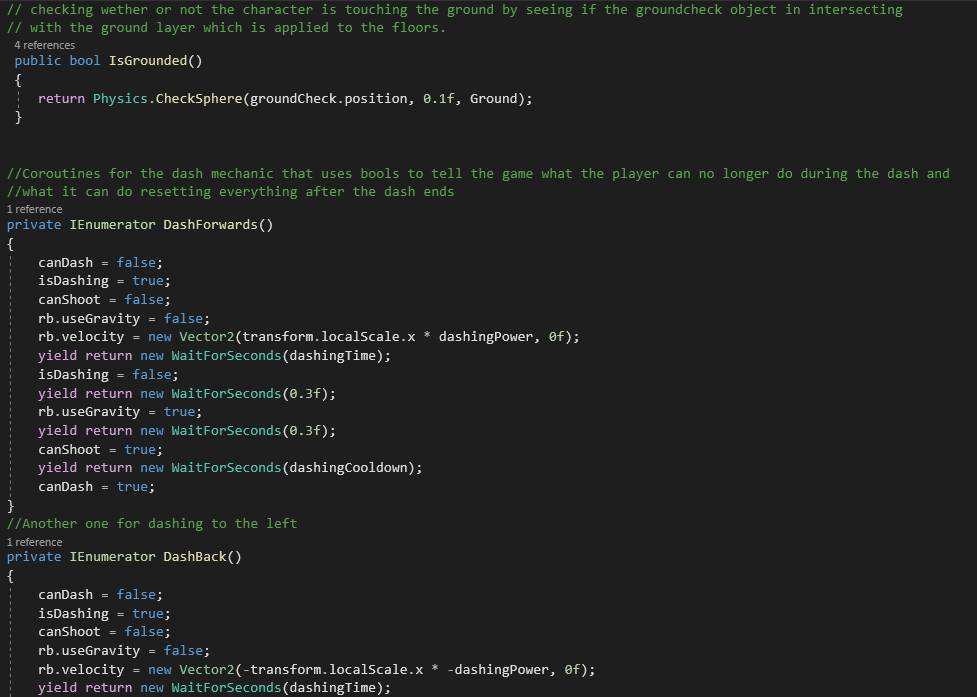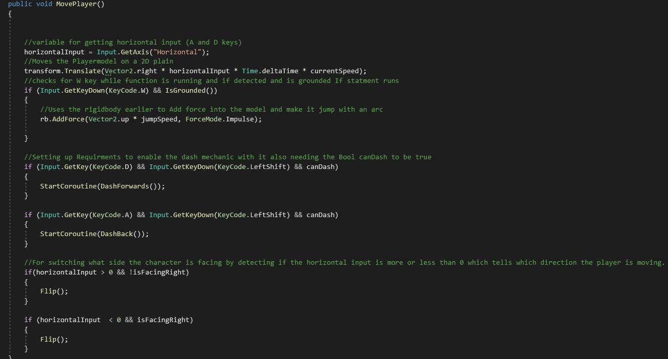 The code for the basic movement of the player with it getting the Horizontal input for left and right movement instead of assigning each key to a certain direction and using the asigned speed times by the Time.deltatime to figure out how fast the character should be moving with Time.deltatime being used so the character wouldnt move faster or slower depending on framerate. with jumping it was a bit more complicated with me having to apply a force to the player to make the jump somewhat more relaistic with an arc, and with only an impule force as to only apply the force once momentarily to stop the player from flying away also there is a ground check on the if statment as to not let the player jump continuously. the if statements for the dashing require 2 buttons to be pressed or held down together and that canDash = true as to stop back to back dashing. the if statements for flipping work by detecting if the HorizontalInput is posative or negative as going left is -1 and right is 1 which then lets the program know which way they should be flipped.