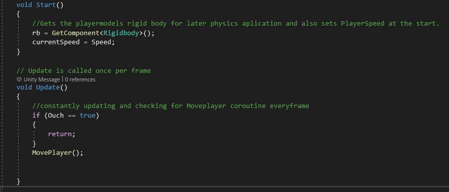 at the start gets the players rigidbody for jumping and sets the current speed to the defult speed veriable also in updates it is always checking the coroutine to see if it should run based off of if statements and also looks out for a bool that will stop the moveplayer coroutine if true for a set amount of time.