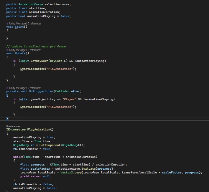 The pickup animation works with an animation curve this code was mostly given to us by our lecturer on how to set up the curve and its parameters all we had to do was play with the curve to get the effect we wanted.