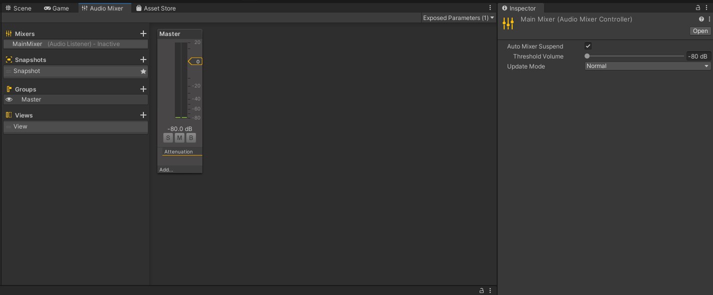 To set up the audioMixer first you pull up the AudioMixer screen by going to the window tab - Audio - Audio Mixer and when on the audiomixer screen click the plus by where it says "mixers" and name it whatever you want then you have to expose the parameters on the newly made mixer at the top right underneath the three dots.