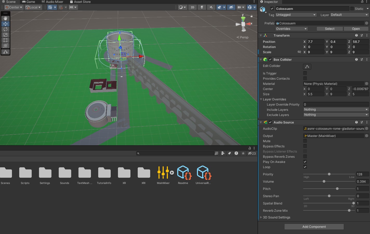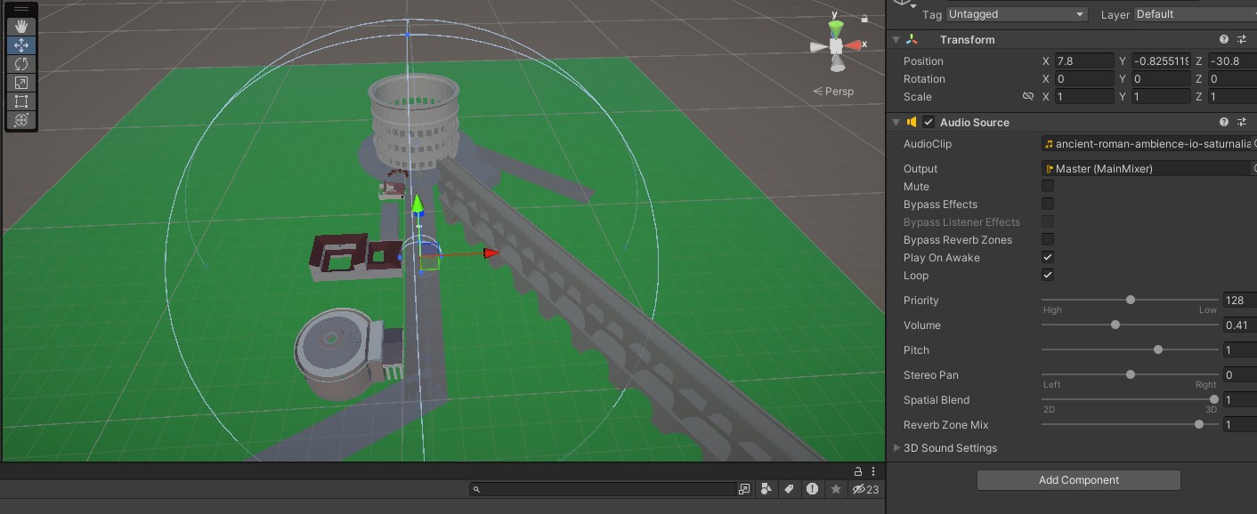 for the colosseum audio instead of making an empty object, I attached it directly onto the colosseum and did the same things as I did for the background audio but with less range as I didn't want the colosseum to be heard from too far away as it wouldn't be too realistic as the sound should be confined within the walls and somewhat muffled.