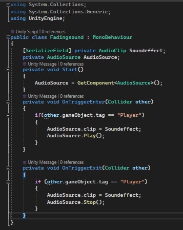 The Fading sound script is no longer needed now I managed to get the regular audio source 3D sound working however at the time I made the script to control when and where the sound will play using the ontriggerenter and exit to decide when to start and cut off the audio. this method required me to call the sound effects and audio source in the code which is inefficient.