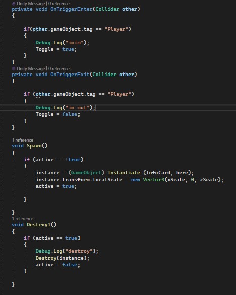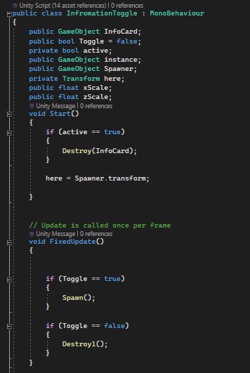 For the Information toggle script, it first grabs the prefab of the information card which you can assign the object in the inspector, and also grabs the spawner to find the location of where it needs to instantiate, the spawner is simply an empty gameobject in the needed location. at the start, it checks if the card is already active and spawned in if so it will destroy the card so there is nothing when you first spawn in. There are 2 ways to spawn in the cards either by entering a Trigger which will instantiate the card at the spawner or when you pick up an object and press the right trigger it will spawn the card. the trigger works as the spawn and despawn runs on a bool which can be changed by the controller when the input manager detects the trigger gets pressed and it sets the bool as active. however you have to hold down the trigger for it to work currently this could be improved on if I ever come back to the project, also for this project while this method works for such a small game it is better to already have the cards in the scene but have their mesh's disabled and enabled when these actions happen instead.