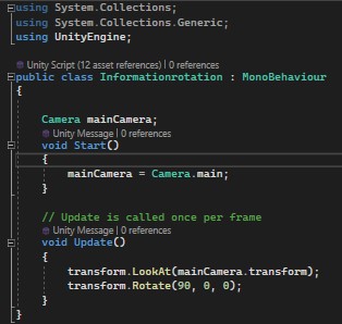 The information rotation script is rather simple in the sense that all it does is get a reference to the main camera and tell the cards to always transform to look at what we declared as the main camera's transform.