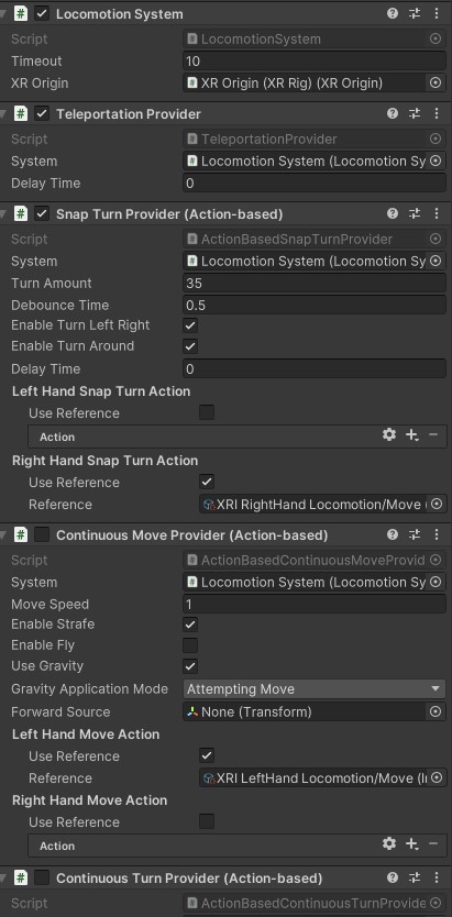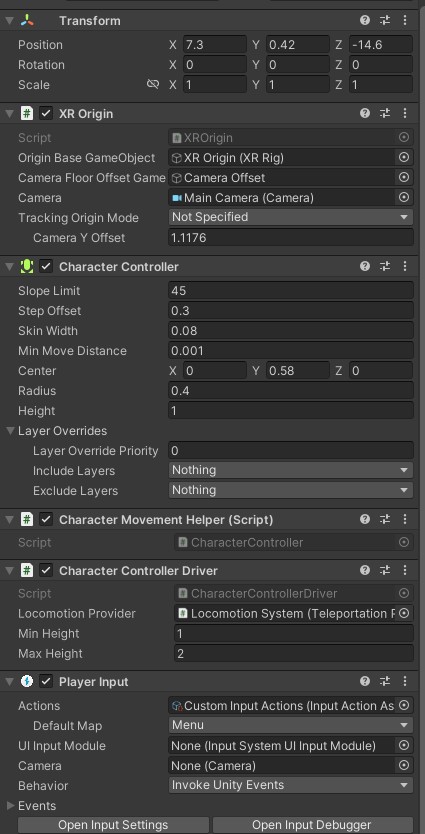 First I had to set up the Locomotion system and XR Origin for movement that required the Locomotion System to have the teleportation and snap Turn provider attached and for the XR Origin I had to attach a Character Controller and make my own Character controller script where it grabs the components of the XR Origin and the character driver and controller to make the rigid body adjust when the player lower or raises the headset which in most cases is standing up or crouching down. this is good as it makes the rigidbody more realistic and adapts to how tall you are at the time meaning you can crouch under an object if you want. however, all of this is clamped so you cannot break the game.