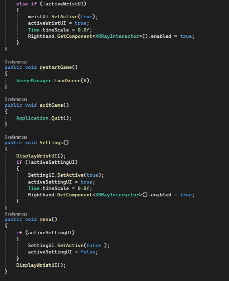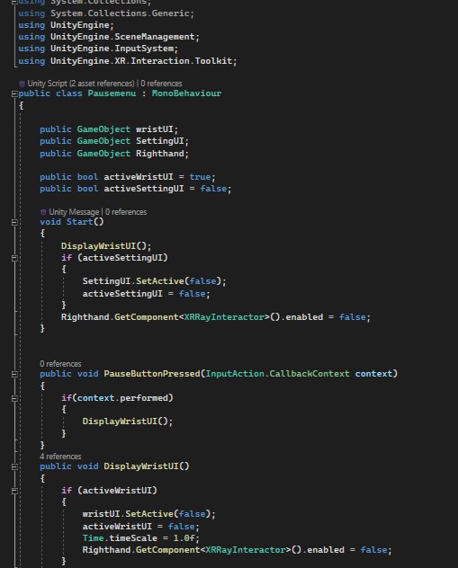 The code for the Pause menu was complicated at first to set up however it made sense the further along I progressed. first I had to grab a reference to everything I needed which is the canvas for both menus those being the pause menu and settings and also getting the righthand to refer to the rayinteractor on it. there are 2 bools to tell if a canvas is up or not. at the start, it checks if the pause menu is running, and if it is the code turns off both the pause and settings menu just for safe measure and turns off the righthands rayintoractor as it should only appear when you activate the menus. then a Coroutine where it checks for the pause button pressed and if the input action declared in this context is pressed it runs another Coroutine which spawns the pause menu. if the button is pressed when the menu is already up and "activeWristUI" = true it removes the pause menu and sets everything to false but if "activeWristUI" doesn't equal true it activates the wristUI and sets "activeWristUI" to true and also sets the time scale to 0 pausing the game in the background also enabling the right hands rayintoractor so you can press the buttons on the menu. If you click on the settings button it performs the same routines but with the canvas being the settings canvas instead and it disabling the pause menu until you click a button to go back. on the pause menu, there are 2 other buttons one to quit the game which when pressed just runs an Application.quit() command, and a restart level button that reloads the scene.