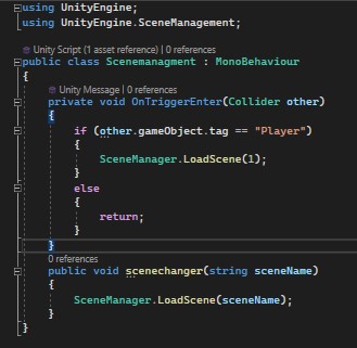 The scene management script is quite simple with a ontriggerenter for the first level door and then a scene loader using the scene name so I can simply put it on buttons and change which scene they load individually.