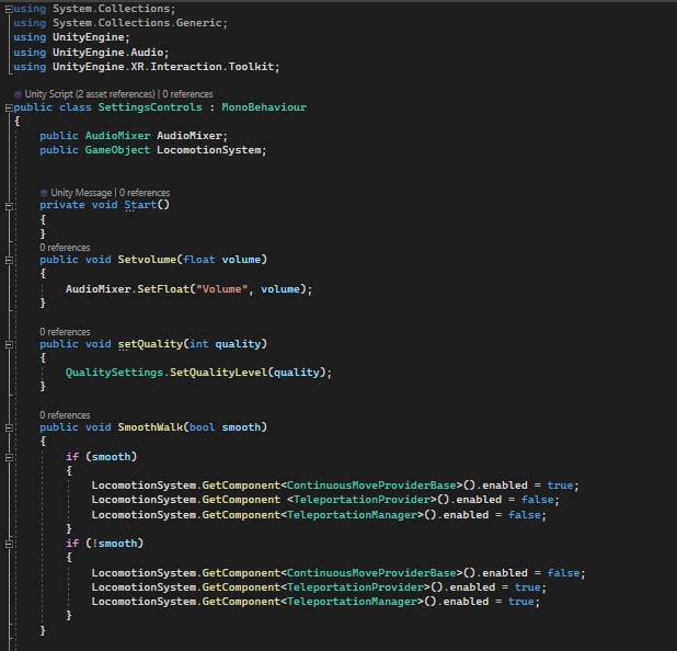 The setting menu allows you to change 4 things those being the master volume of the game, and the graphics quality and allows you to change the movement and turning to either smooth or snap and teleporting individually for player comfort. to do this I first needed to reference the master audiomixer and the locomotion system to access the scripts on it. the audio mixer already has code for the job with that being .setFloat allowing you to change the float value of the volume, to make this work you attach the script to the main canvas and on the slider under on Value changed to also drag the script that's on the canvas into it and go to the function and find the script and use the "Coroutine name" Dynamic float. setting the quality was quite easy as there is already inbuilt code in unity of "Qualitysettings.setQualityLevel" It uses integers of 0,1,2 to cycle through 3 preset quality levels all you have to do is add them onto a Dropdown textmeshpro and on value change choose the Dynamic Int. to change the movement and turning code in settings I just used 2 checkmark boxes to tell if you have the smooth turn or walking enabled if checked they disable to teleportation code and enable the movement code and vice versa. I am quite happy with how the settings turned out to be functional and helpful to the player with me not expecting to manage to get the changing of scripts to work.