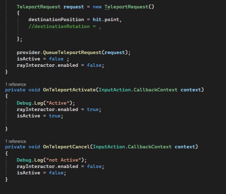 at the start of the script, it grabs 2 Inputs from the default XRI input manager for the left hand specifically and one from "Move" which is where the joystick input is stored. in the update it keeps checking for the conditions to run the teleport being if "Isactive" isn't true it returns and no action is performed. to make "Isactive" true the input manager has to sense the teleportation action activating which also turns on the rayInterator so the player can see where they are teleporting to and so the game can get the raycast hit transformation of where it needs to go. then Update looks for if the joystick has moved by constantly getting its vector 2 and if it's anything other than 0 it means the joystick has moved in some direction. then if the rayinterator isn't enabled or if the raycast hit isn't on a teleportation area it sets the rayinterator off and is active off, this is for when you try and teleport to an area that isn't meant to be teleported on so it doesn't run the rest of the teleportation code to move the player there. if everything goes through it sends a Teleportation request with the destination being the Hit.point at the end of the curved ray, there is also an option of setting the rotation and maybe in the future if I would do something like this again I could match the final teleportation rotation to match that to the angle of the joystick but at present, I had no clue how to do so. once the request goes through and you get teleported it sets "Isactive" to false and the Rayinterator off.