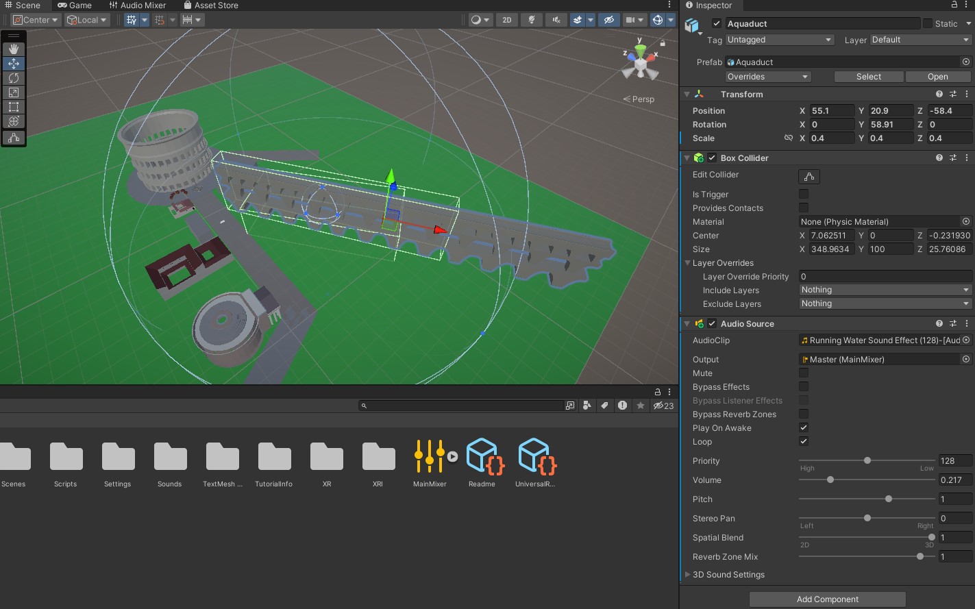 For the aqueduct, I followed the same steps as the colosseum but with a smaller min range and much larger max range as flowing water usually can be heard from very far away but as I didn't want it as loud I made the minimum distance smaller so its more spread out across the distance.